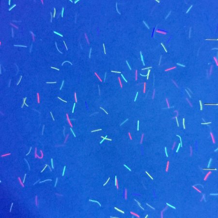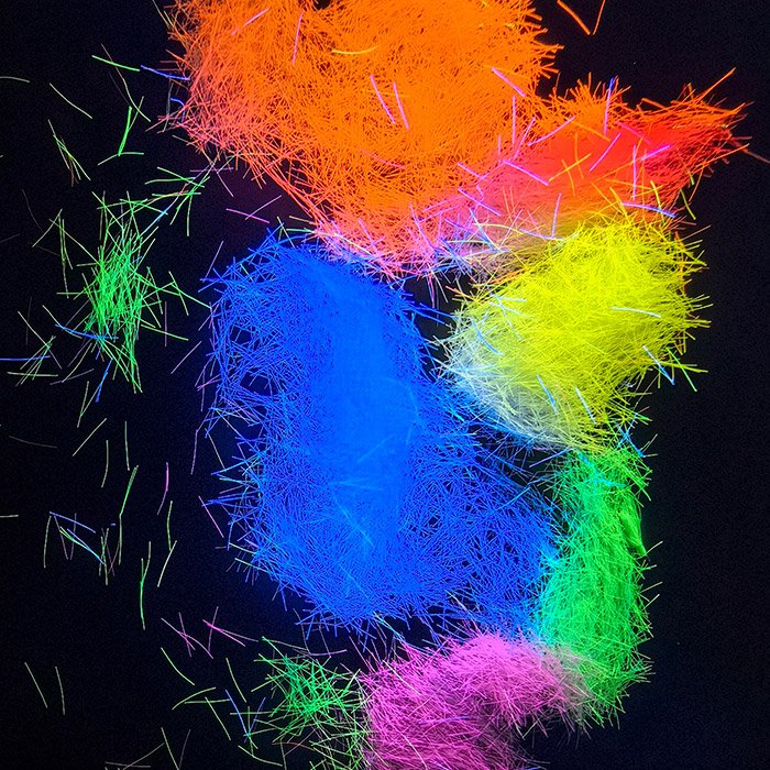 无色荧光纤维丝 | 紫外灯下红、黄、蓝、绿、橙、黑、品等 | 10-100㎛ | 0.5-10MM | 聚酯 | 0.9-1.1 (25℃) | 直、弯曲 |
