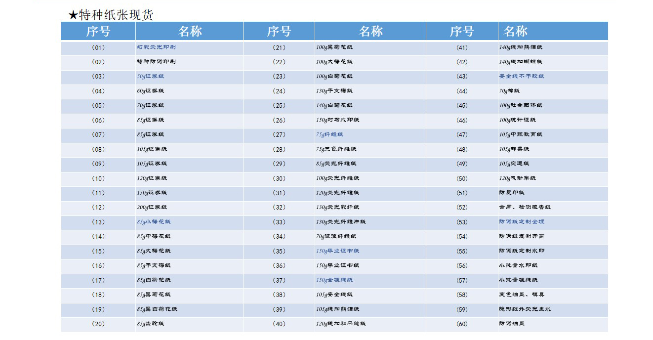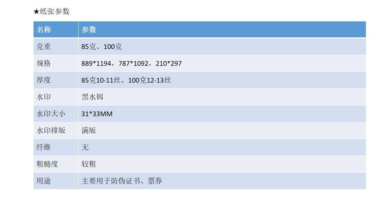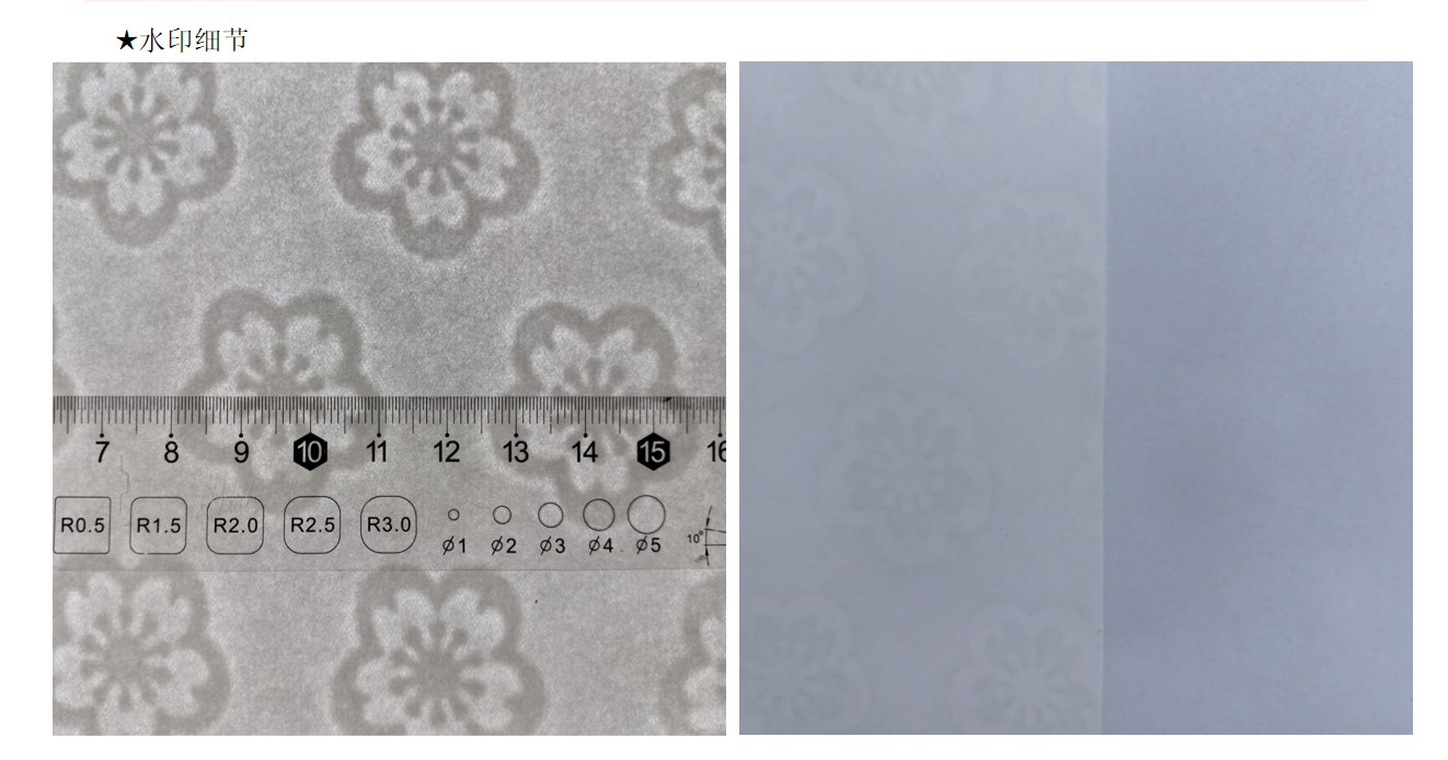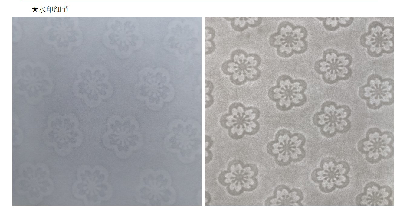水印纸:水印纸是有(yǒu)浮雕、可(kě)触摸图像、条码等的纸张。钞票用(yòng)的便是水印防伪技(jì )术。因水印不能(néng)用(yòng)影印机、扫描器等再现,故其防伪效果甚受重视。